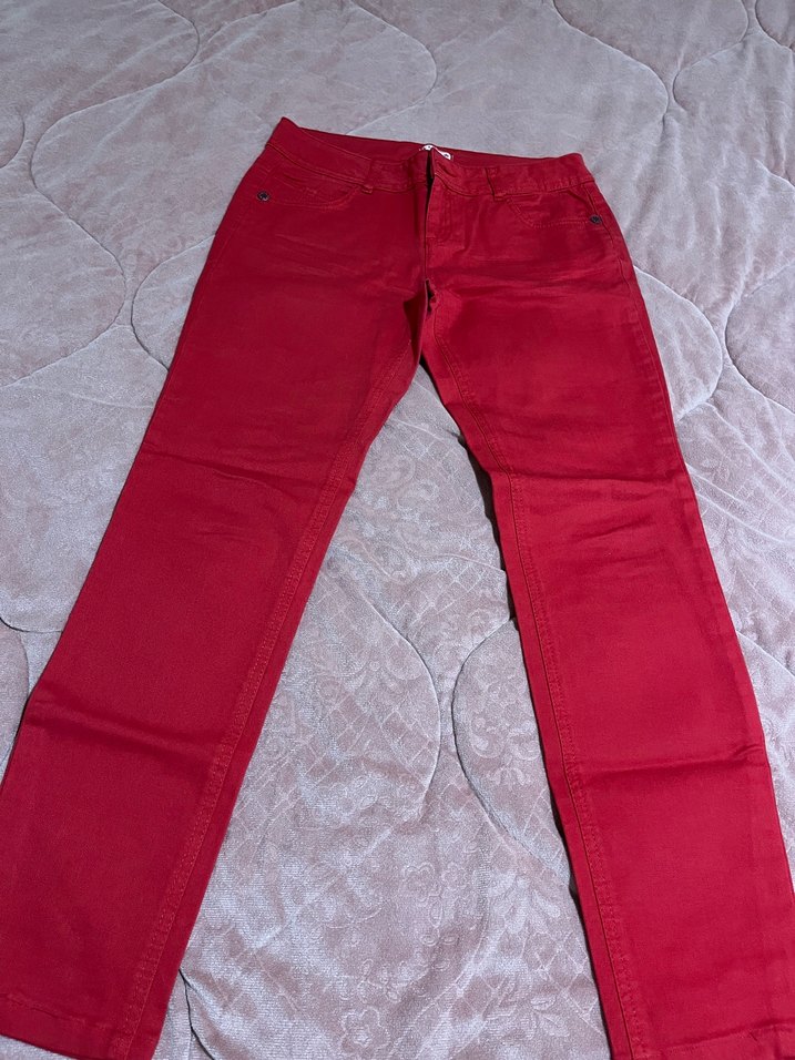Kadın kırmızı pantolon, düğmeli ve parlak görünümlü. Normal boy, rahat ve günlük kullanım için uygun.