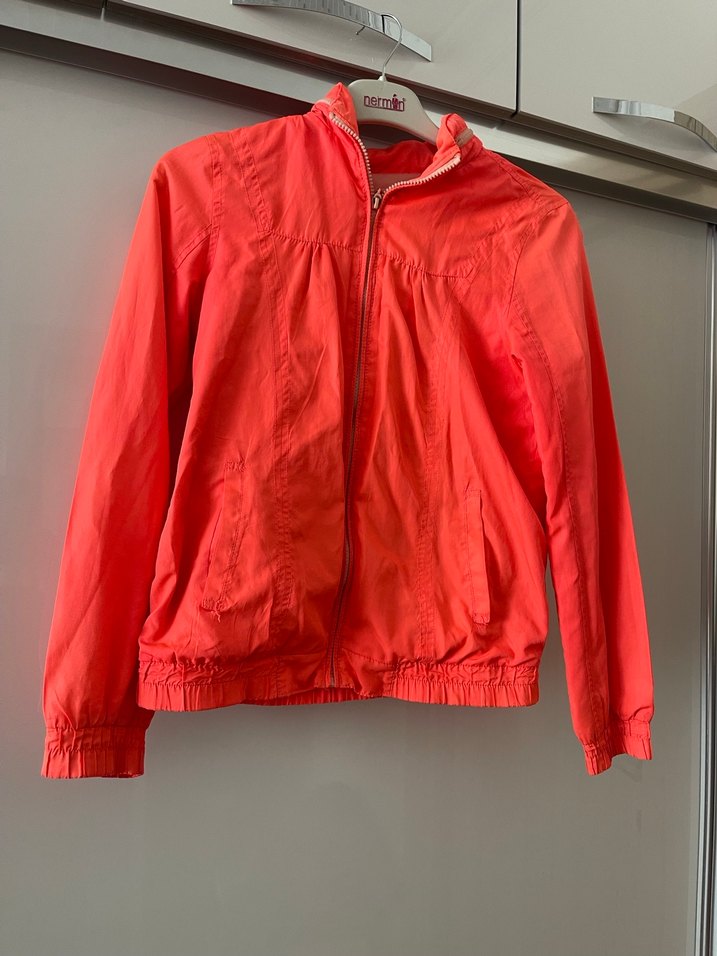 Kadınlar için parlak kırmızı renkte, fermuarlı, uzun kollu, yüksek yakalı ve bol kesimli ceket. Sentetik kumaştan, rahat ve sokak stili için uygun.