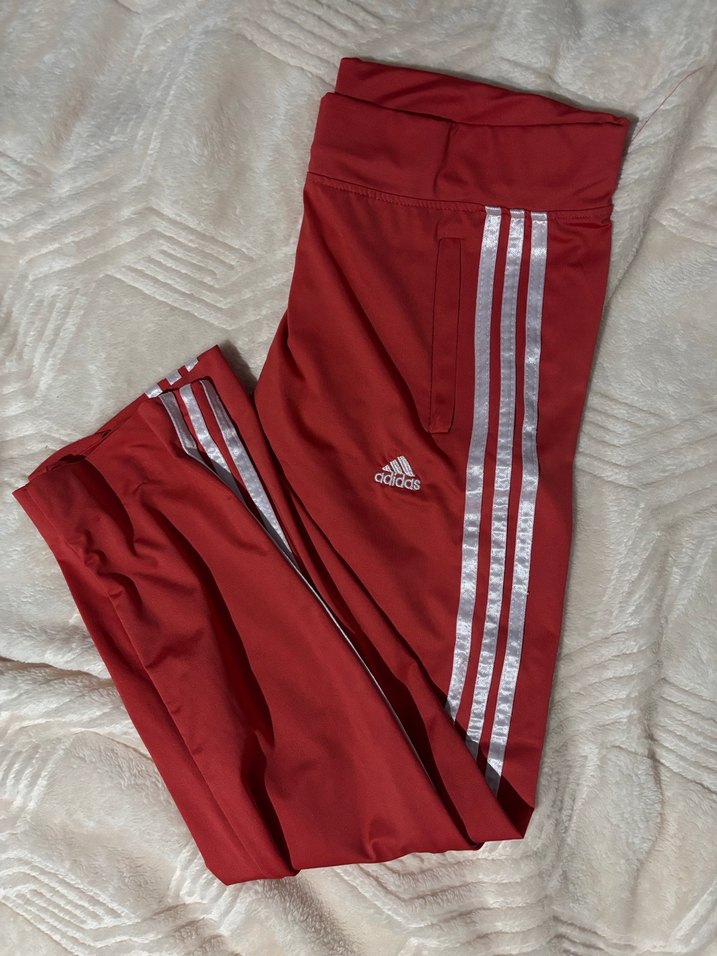 Kadınlar için kırmızı, parlak şeritli ve fermuarlı cepli, sentetik kumaştan yapılmış, spor ve şık eşofman altı. Aktif ve trend günlük kullanım için uygundur. paçası uzun geldiği için kendim biraz diktim ama sökülüp diktirilebilir yırtık falan yok sağlam, orj değil