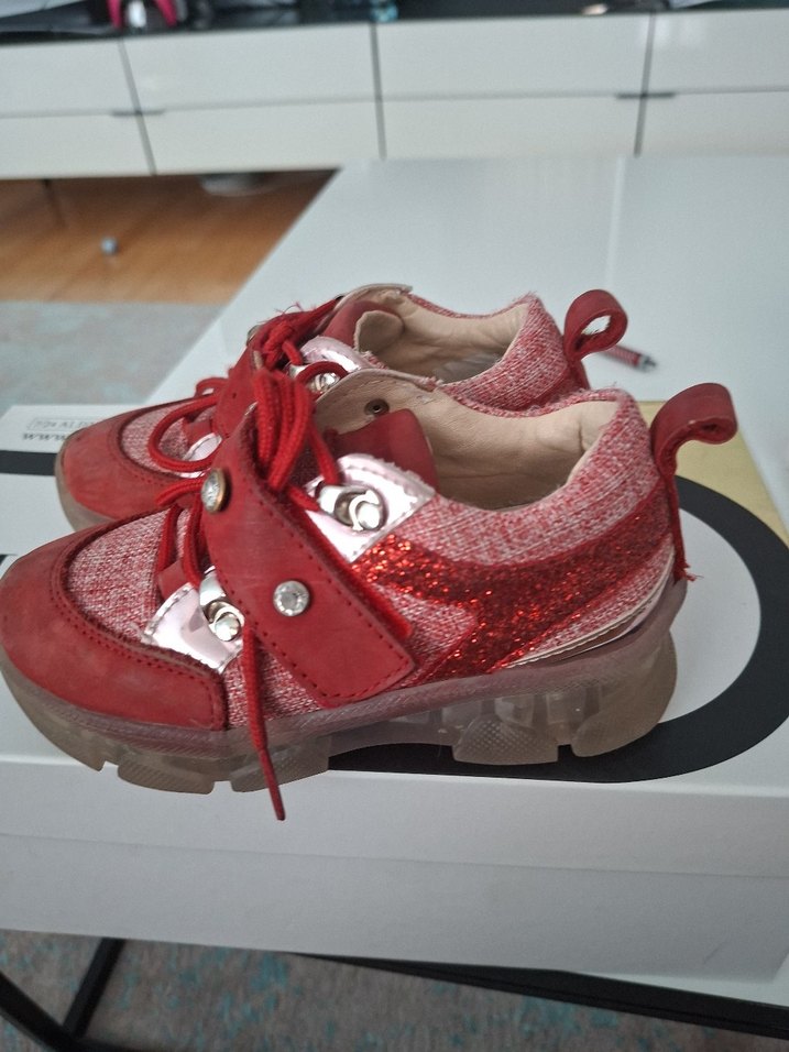 Kırmızı kadın spor ayakkabısı, yüksek topuklu ve cırt cırtlı detaylı. Kauçuk malzemeden, parlak baskılı desenli, sokak stili ve günlük kullanım için uygun.