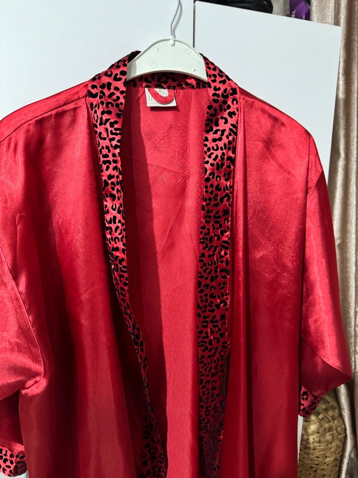 Kadınlar için kırmızı, parlak yılan desenli sabahlık. Uzun kollu ve bol kesimdir, çağdaş ve göz alıcı bir tarz sunar.