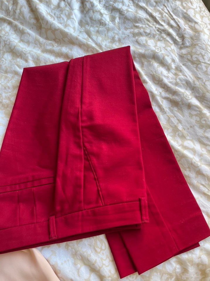 Kadın kırmızı, saten kumaştan, pilili ve normal boy midi pantolon. Minimalist, parlak ve rahat kesim, ofis stiline uygun. ✨
