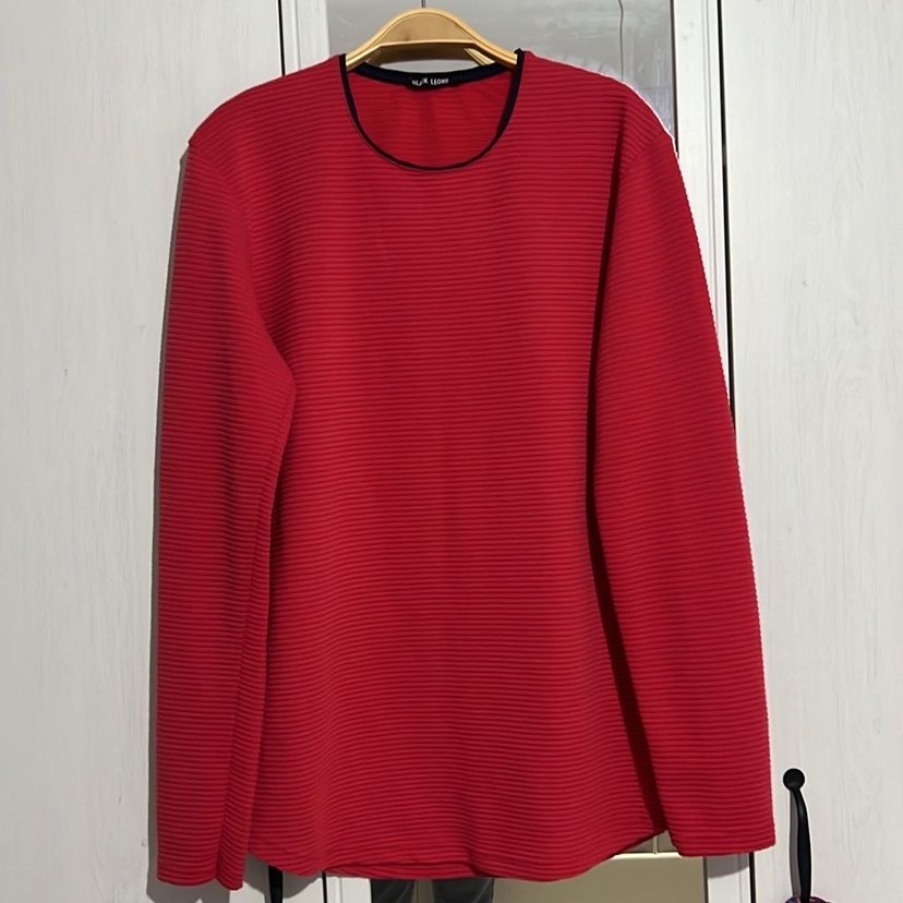 Kadın kırmızı piliseli, yuvarlak yakalı ve uzun kollu kazak. Rahat kesimi ve midi boyu ile günlük kullanıma uygun, sade ve minimal tarzda bir model.