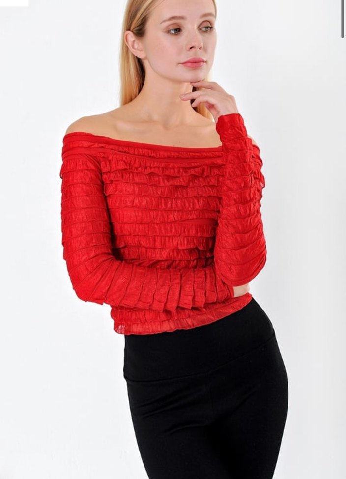 Bu kırmızı, kayık yakalı ve uzun kollu, pliseli detaylı, kısa kesim triko bluz, ofis için modern ve cesur bir görünüm sunar. ✨