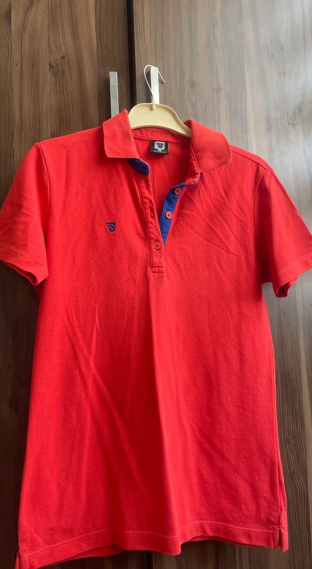 Kısa kollu, yakalı kırmızı kadın polo tişört, mavi düğmeli detaylı. Pamuklu kumaştan, dar kesim, günlük sokak tarzı için uygun.