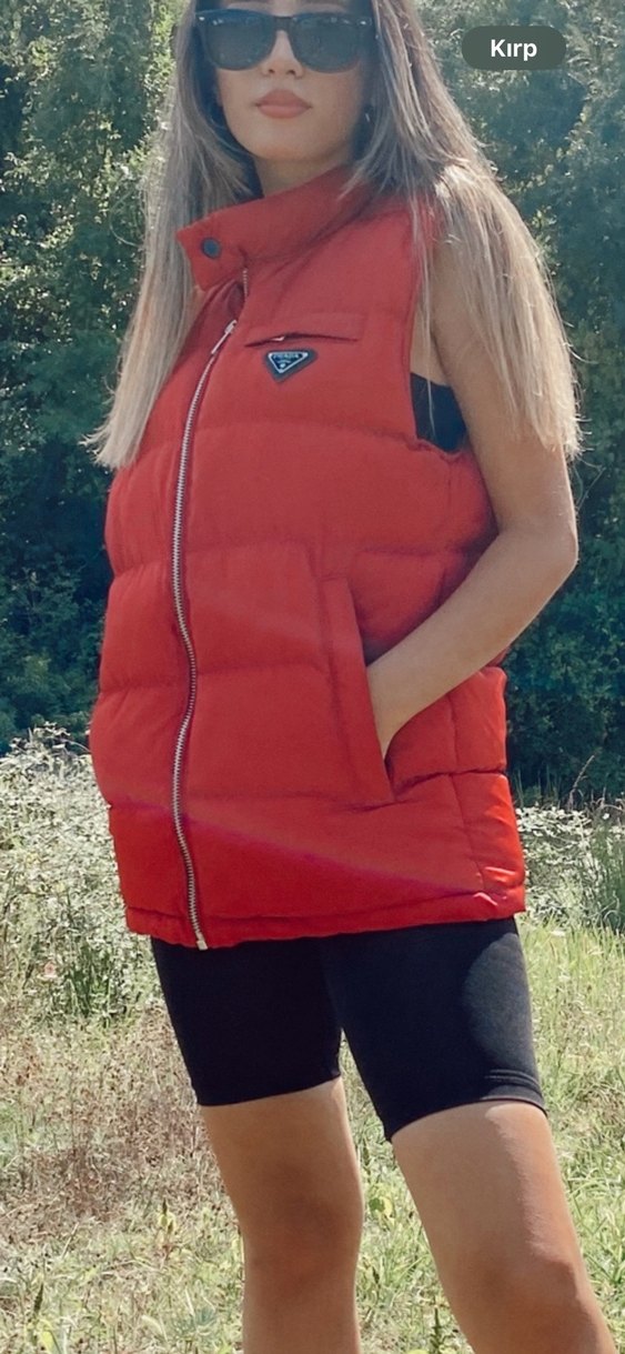 Kadınlar için yüksek yakalı, parlak kırmızı şişme yelek. Kolsuz, fermuarlı ve yumuşak, sıcak kumaştan, dış mekan kullanımı için uygundur. Trend ve spor tarzına uygun.