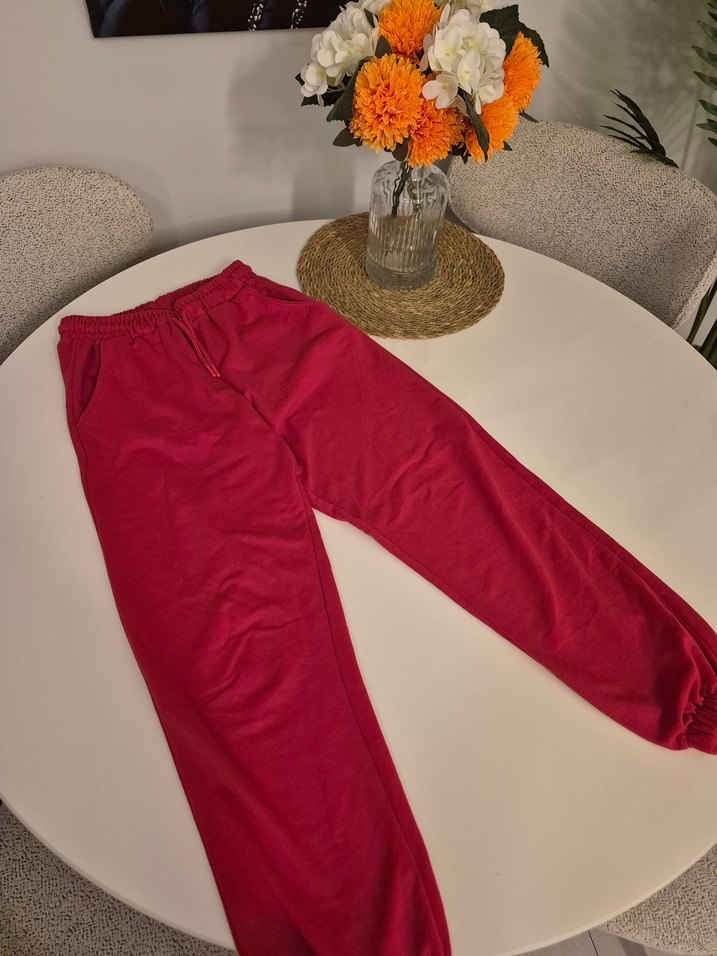 Kadınlar için parlak kırmızı renkli, rahat kesim ve yumuşak, sıcak kumaştan eşofman altı. Normal boyda ve zahmetsiz şıklık sunar, günlük kullanıma uygundur.