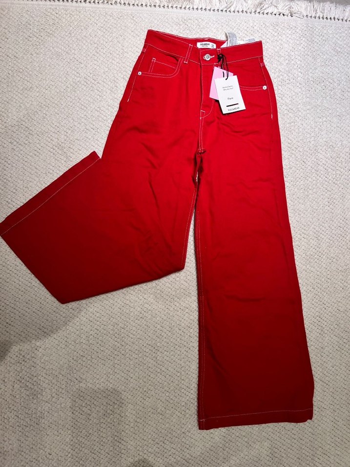 Kadınlar için kırmızı kot pantolon, rahat kesim ve normal midi boyda. Pamuklu kumaştan, gündelik kullanıma uygun şık ve rahat tarz sunar.