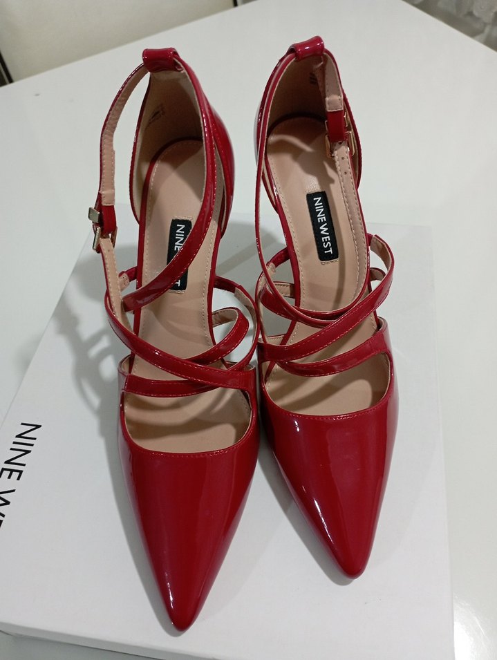 Parlak kırmızı rugan görünümlü, tokalı ve ince topuklu kadın stiletto ayakkabılar. Minimalist ve çağdaş tasarıma sahip, ofis kullanımı için uygun. Marka: Nine West.