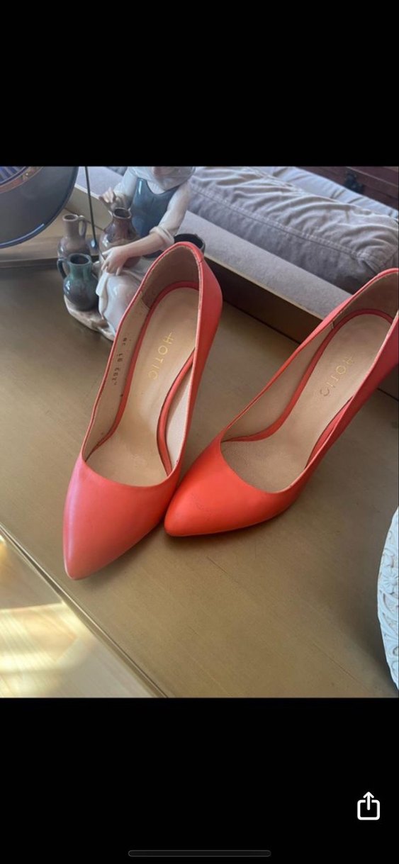 Rugan kırmızı renkte, lastik malzemeden yapılmış parlak stiletto topuklu ayakkabılar. Minimalist ve çağdaş tasarıma sahip, romantik akşamlar için uygun.