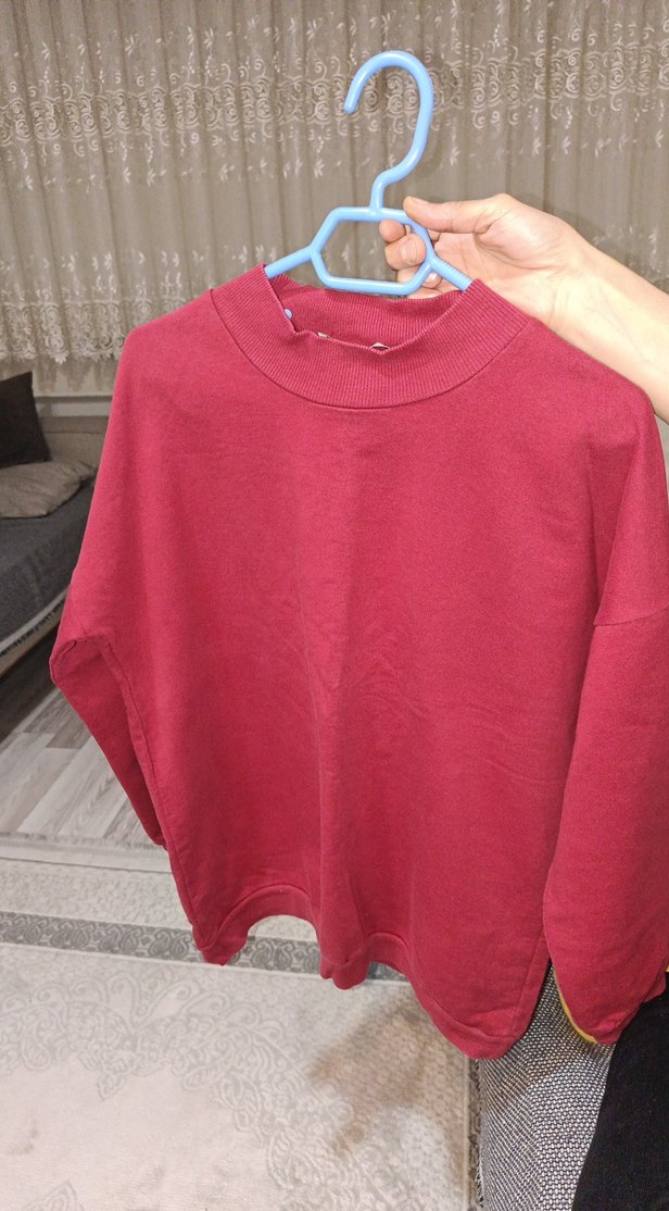 Kırmızı renkte, yuvarlak yakalı ve uzun kollu, salaş kesim kadın sweatshirt. Yumuşak ve sıcak kumaştan, günlük rahat stil için uygun.