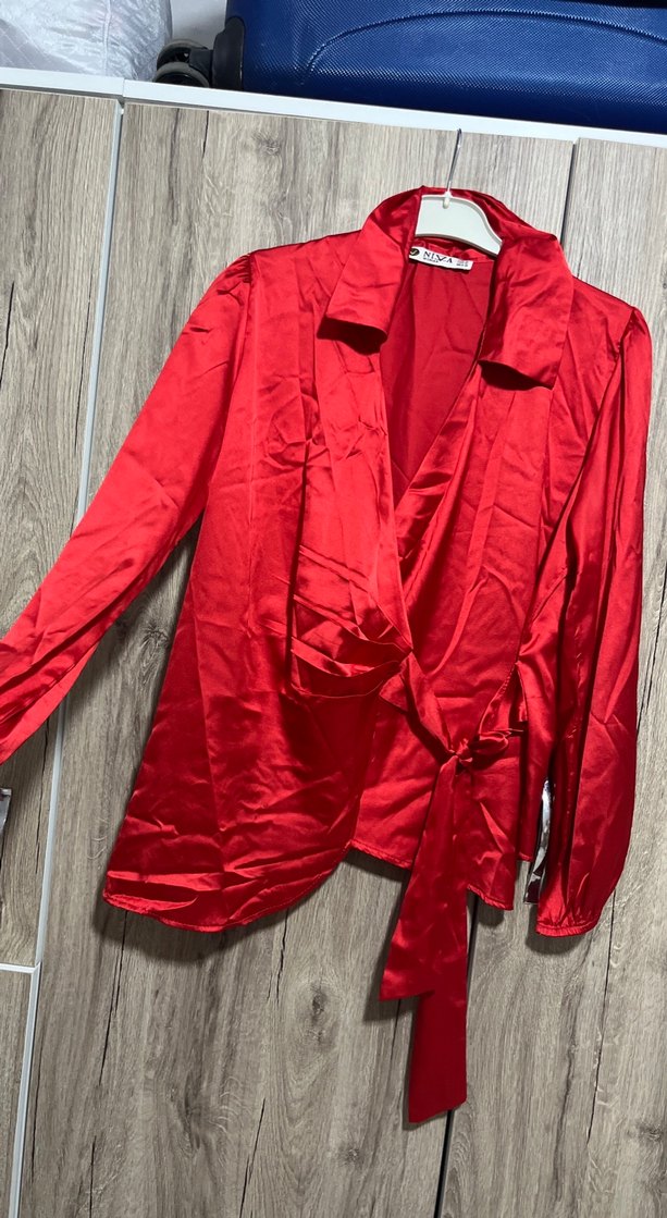 Kadınlar için notched lapel yakalı, uzun kollu, saten parlak kırmızı kumaştan gömlek. Düğmeli, kısa boylu ve regular fit, Paris sokak modası tarzında günlük kullanıma uygun cesur tasarım. Ütülenince tabi daha kendini gösterecekti fotoğrafta aslında