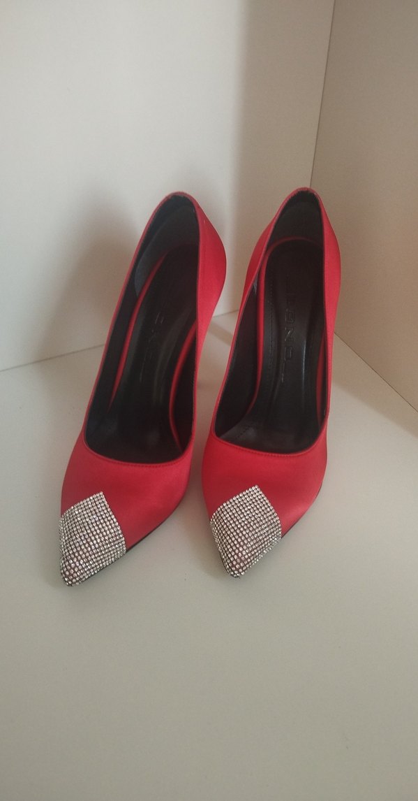(Gülşah Saraçoğlu'nun ayakkabısıdır.) Kırmızı süet stiletto, parlak taşlı uç detaylarıyla cesur ve gösterişli bir görünüm sunar. Romantik geceler için çağdaş tarzda desenlidir.