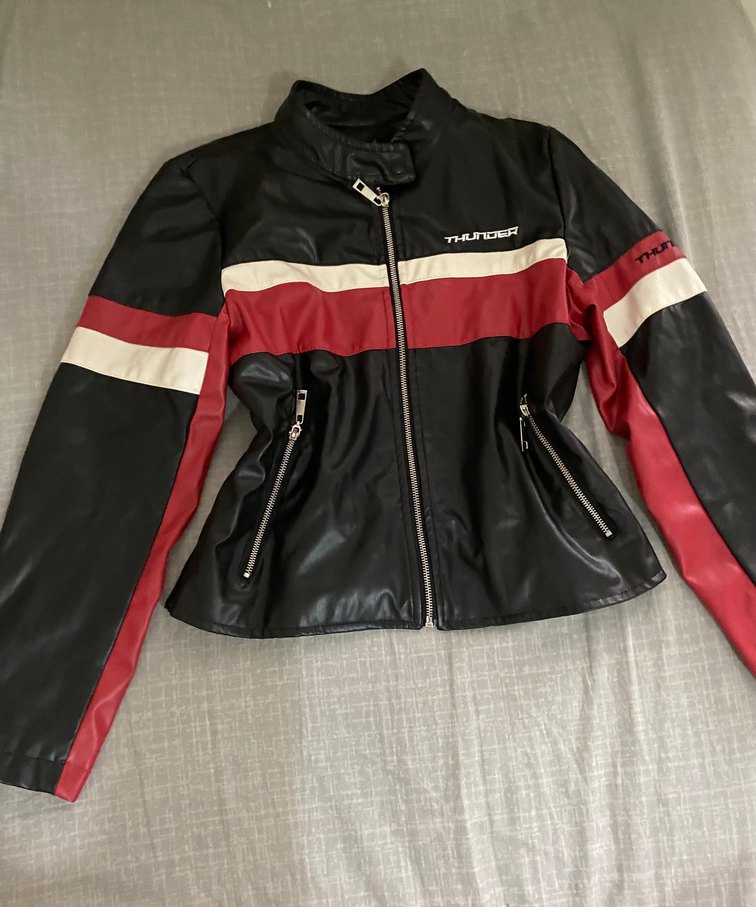 Deri malzemeden, kırmızı ve siyah renklerde, fermuarlı cepli, bisikletçi tarzı, dar kesim kadın ceketi.