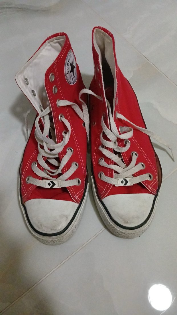 Kırmızı Converse kadın spor ayakkabısı, düz tabanlı ve kauçuk malzemeden üretilmiştir. Renkli ve desensiz, spor ve günlük şıklık için uygundur.