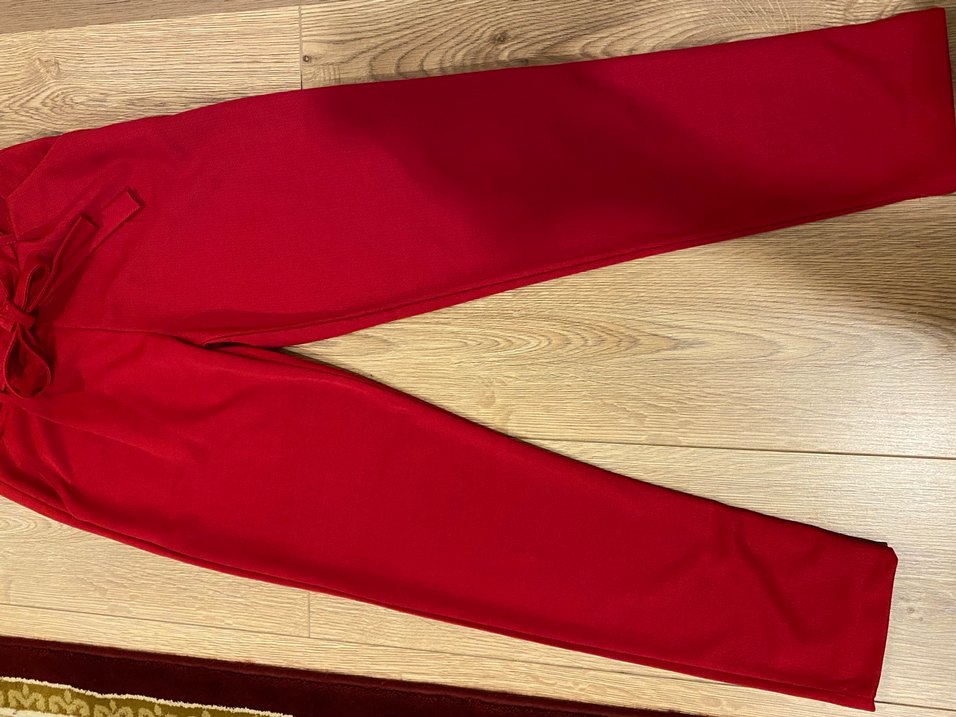 Kırmızı, parlak kumaştan yapılmış, düz desenli, normal boy midi spor pantolon. Velcro detaylı ve rahat kesimlidir likralıdır.