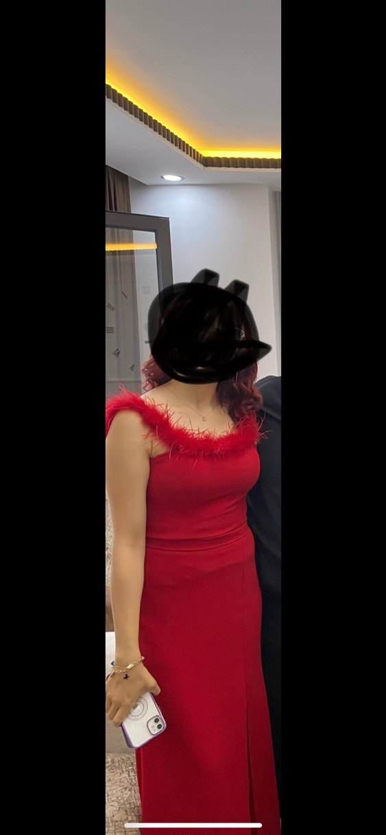 Kırmızı straplez, kürk detaylı, dar kesim uzun yırtmaçlı elbise. Kolsuz mezuniyet ve düğün için uygun. Ablamın düğününde sadece giydim . Üründe herhangi bir deforme vs yoktur.