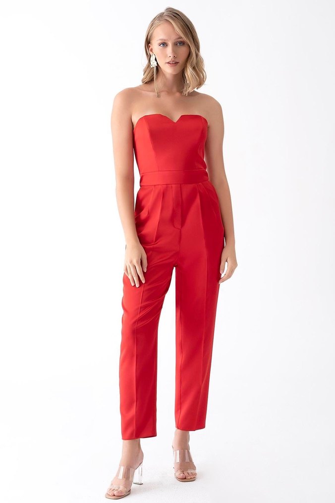 Kadın Kırmızı Straplez Uzun Tulum