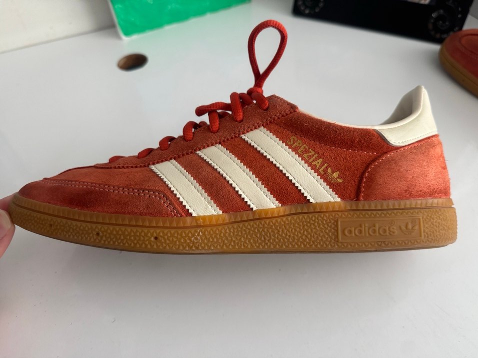 Kırmızı süet malzemeden, bağcıklı ve baskılı detaylara sahip erkek spor ayakkabısı. Adidas markalı, renkli ve dolgu topuklu tasarım.