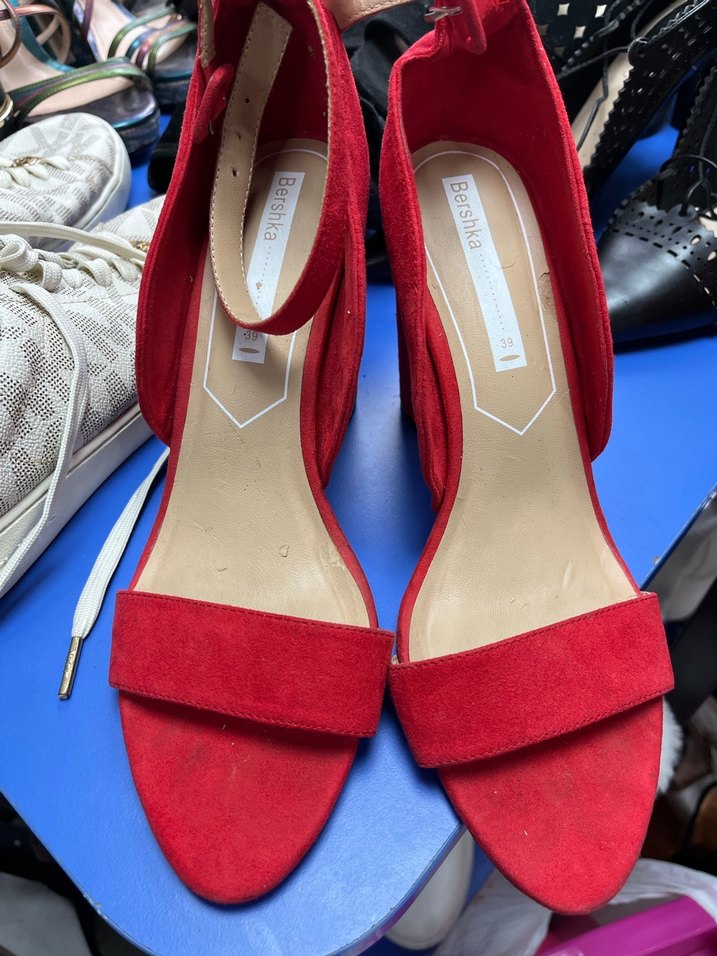 Kırmızı süet, tokalı blok topuklu kadın ayakkabısı. Minimalist ve bohem tarzıyla romantik akşamlar için uygun. ❤️