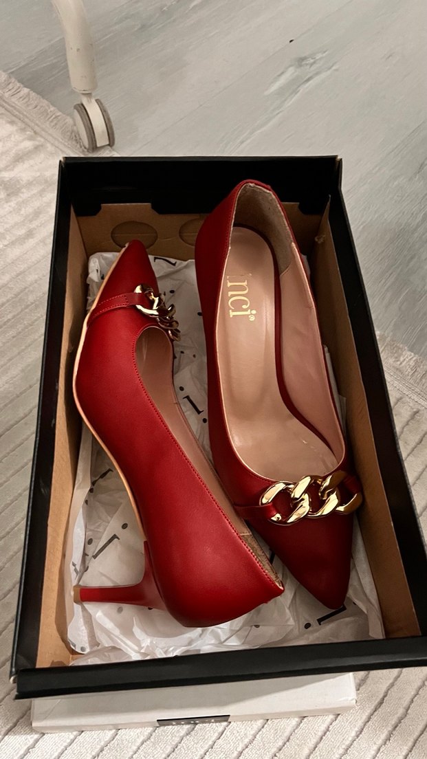 Deri stiletto, yüksek topuklu ve tokalı zincir detaylı. Sıfır gibi