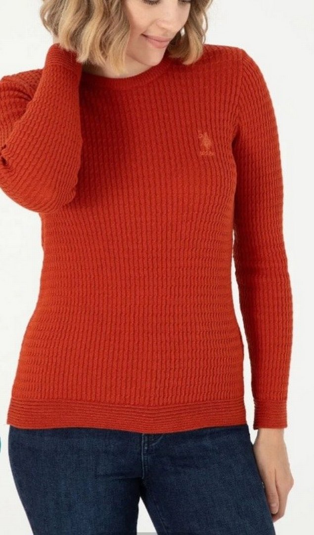 Kadınlar için kiremit renkte, bisiklet yakalı ve uzun kollu, vücuda oturan triko kazak.