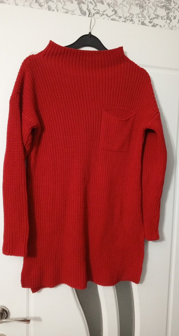 Kırmızı renkli, triko kumaştan yapılmış, yuvarlak yaka ve uzun kollu, bol kesim kazak. Normal midi boyda, önünde küçük cepli, günlük kullanıma uygun.