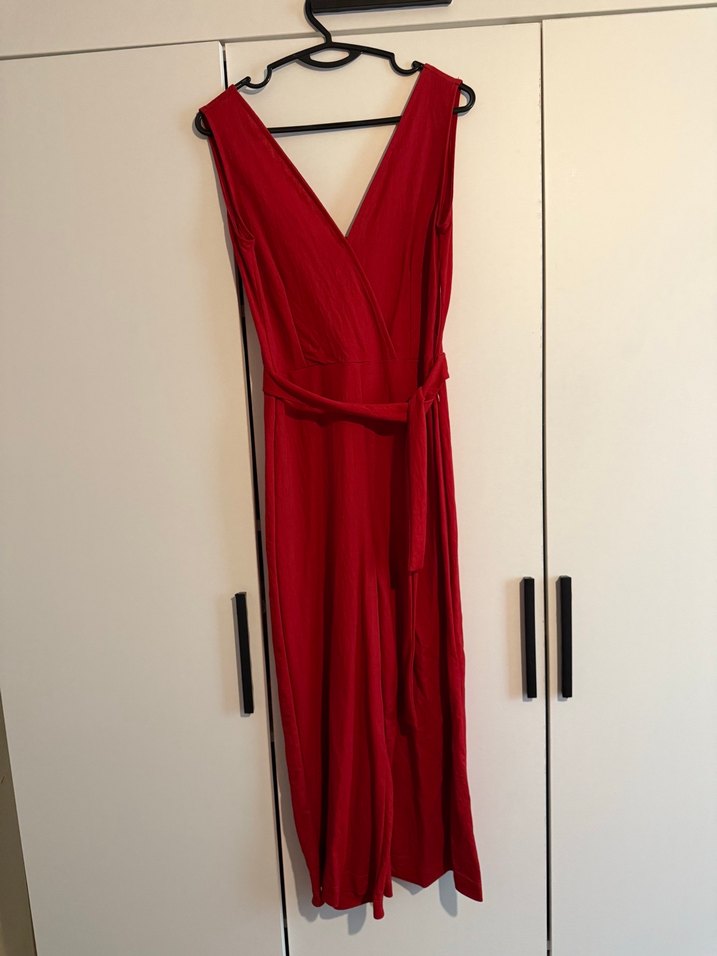 Kadınlar için bilek üstü, drapeli, V yakalı ve kolsuz kırmızı tulum. Sırt detaylı,İnce kesimi ve ipeksi kumaşıyla romantik akşamlar için minimal ve şık bir tasarım sunar. ❤️