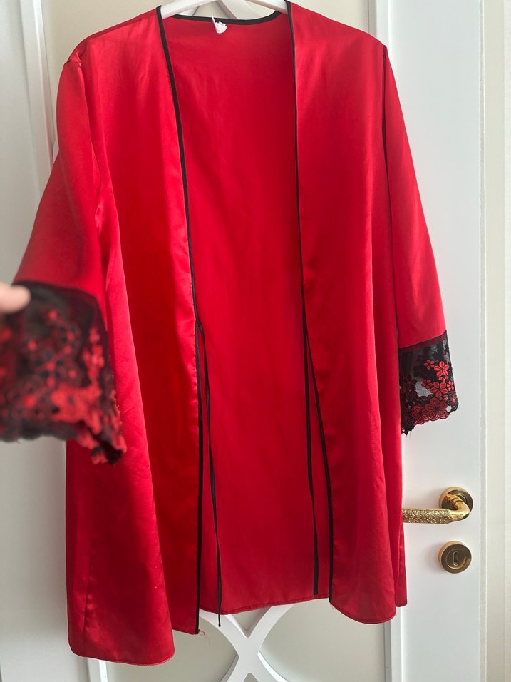 Kadınlar için parlak kırmızı kumaştan, uzun kollu ve bol kesim bohem Paris tarzı nakışlı uzun sabahlık.