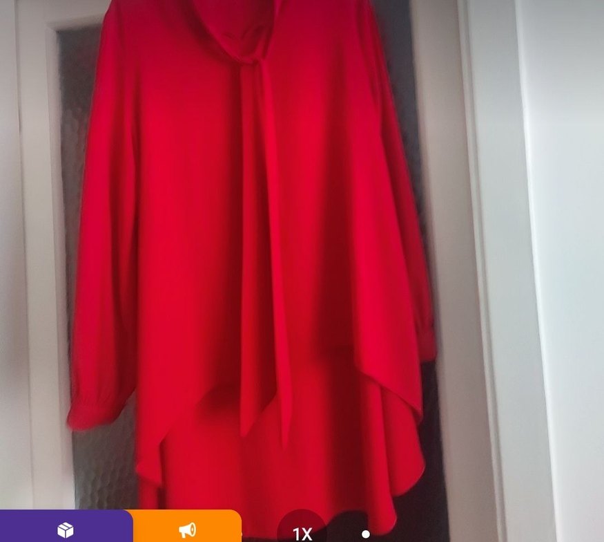 Kırmızı uzun, yüksek yakalı, bol kesim ve drapeli kadın tunik. Uzun kollu, parlak ve desen içermeyen sentetik kumaştan, çağdaş ve minimalist tarzda.42 -46 uyumlu