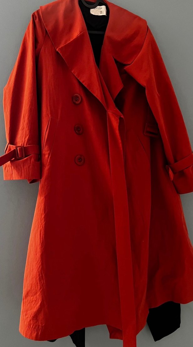 Kadınlar için uzun kesim, düğmeli ve kırmızı renkte, ipeksi dokulu trençkot. Geniş kesimi ve uzun kollarıyla sokak stili için uygun, gündelik kullanımda şık görünür.