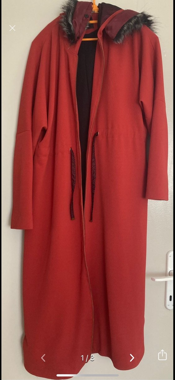 Kadın kırmızı uzun kaban, kesik yaka ve fermuarlı ön tasarıma sahiptir. Uzun kollu, rahat kesim, yumuşak ve sıcak kumaştan üretilmiştir. Minimalist ve desensiz, günlük ve sokak stili için uygundur.