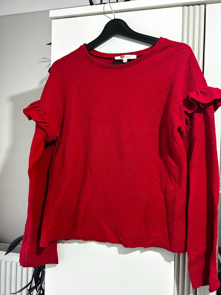 Kadın kırmızı uzun kollu, fırfırlı detaylı, yuvarlak yaka, bol kesim yumuşak yün kazak. Günlük kullanıma uygundur.