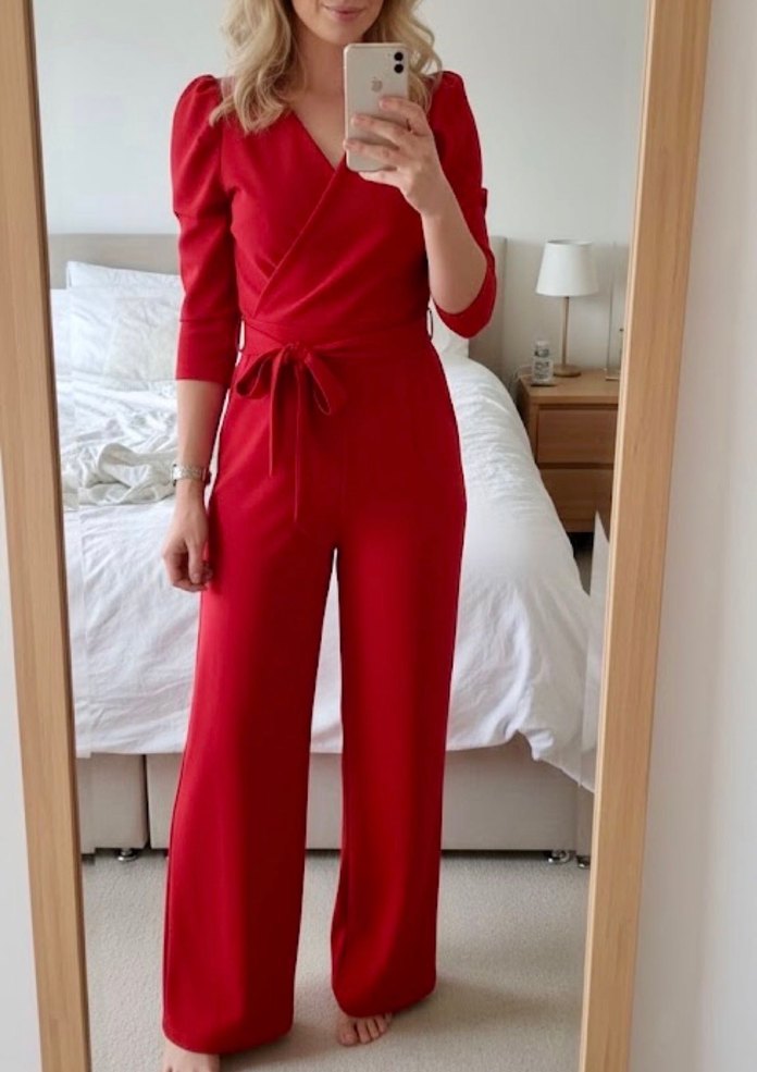 Kadın kırmızı uzun kollu, V yakalı midi tulum. İpek gibi parlak kumaştan, kemer detaylı ve normal kesimlidir. Minimalist, cesur tarz için uygundur. ❤️