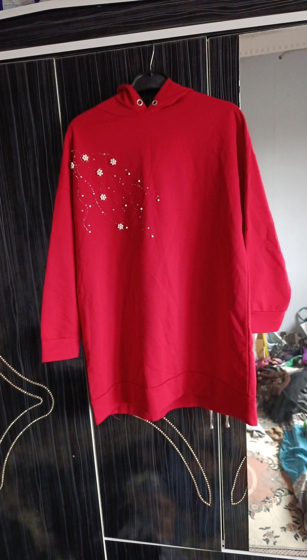 Kadınlar için uzun kollu, bol kesim ve yuvarlak yakalı kırmızı tunik. Sentetik kumaştan, renkli nakış ve payet detaylı, rahat sokak giyimi için uygun.