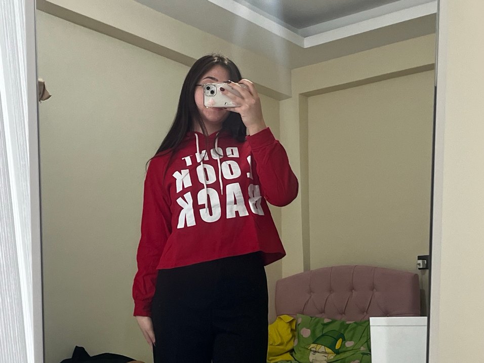 Kadınlar için yüksek yakalı, uzun kollu ve bol kesim kırmızı sweatshirt. Baskılı deseni ve yumuşak, sıcak kumaşıyla rahat sokak stili için uygundur.