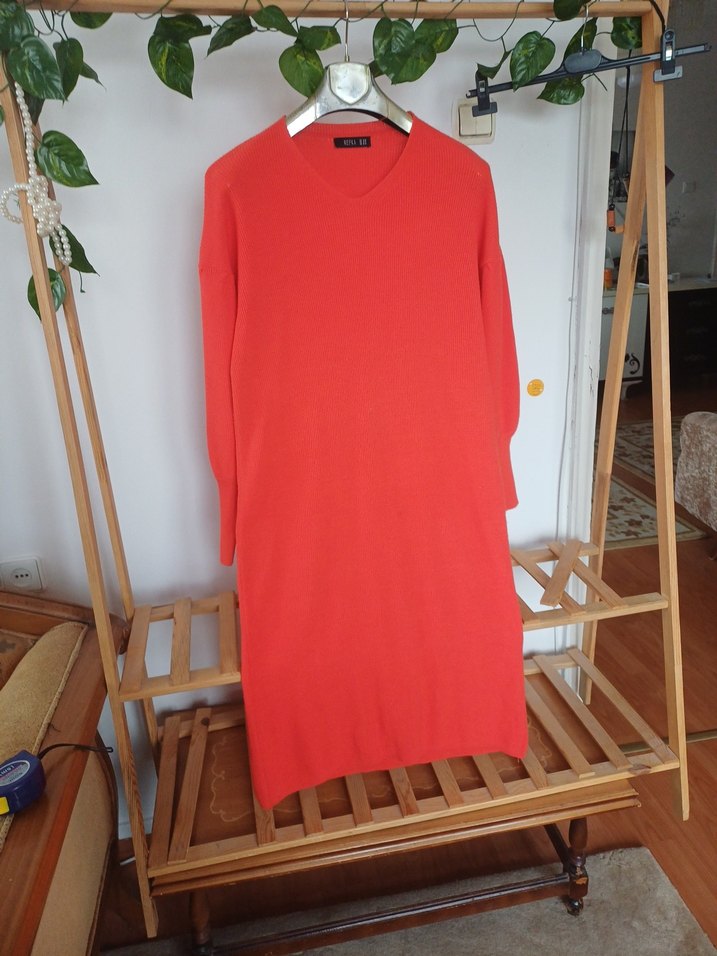 Kadınlar için uzun kollu, uzun boy triko elbise.ve tunik Yumuşak yünden üretilmiş, rahat ve bol kesim. Canlı kırmızı rengi günlük kullanıma renk katıyor. iki kol arası 56 cm boy 106 cm