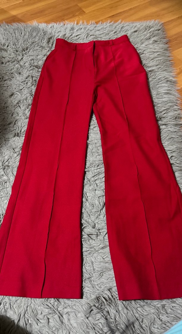Kadınlar için kırmızı, parlak kumaş pantolon, regular fit ve uzun boy. Ofis için uygun, yırtmaç detaylı ve rahat bir tasarım.
