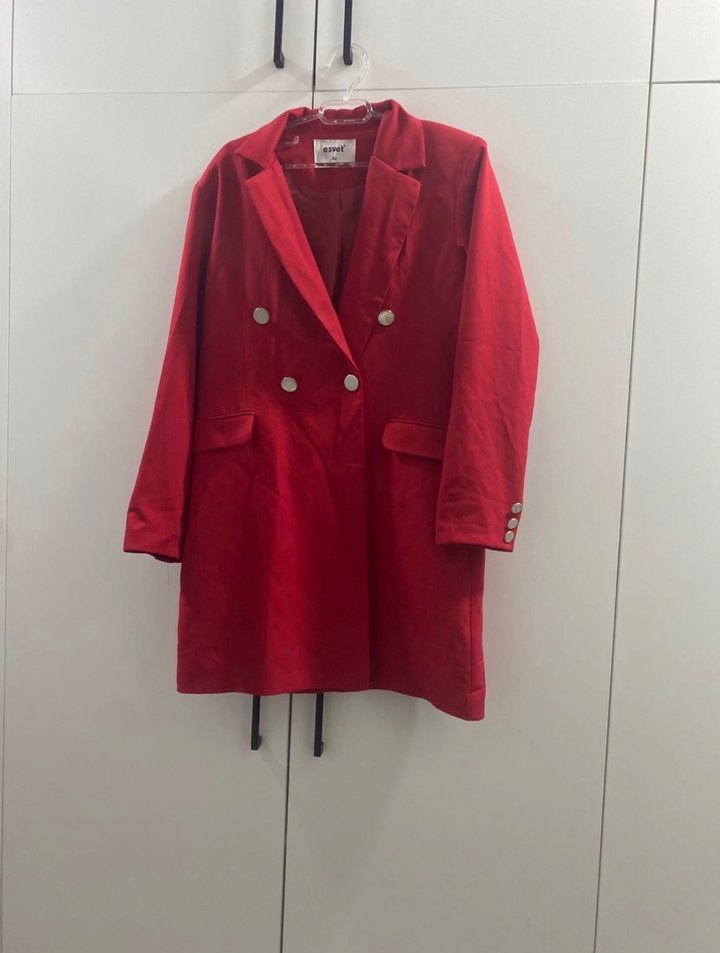 Kadınlar için yaka detaylı, uzun kollu, düğmeli kırmızı süet blazer. Uzun boyu ve sade deseniyle ofis ve günlük kullanıma uygundur.✨