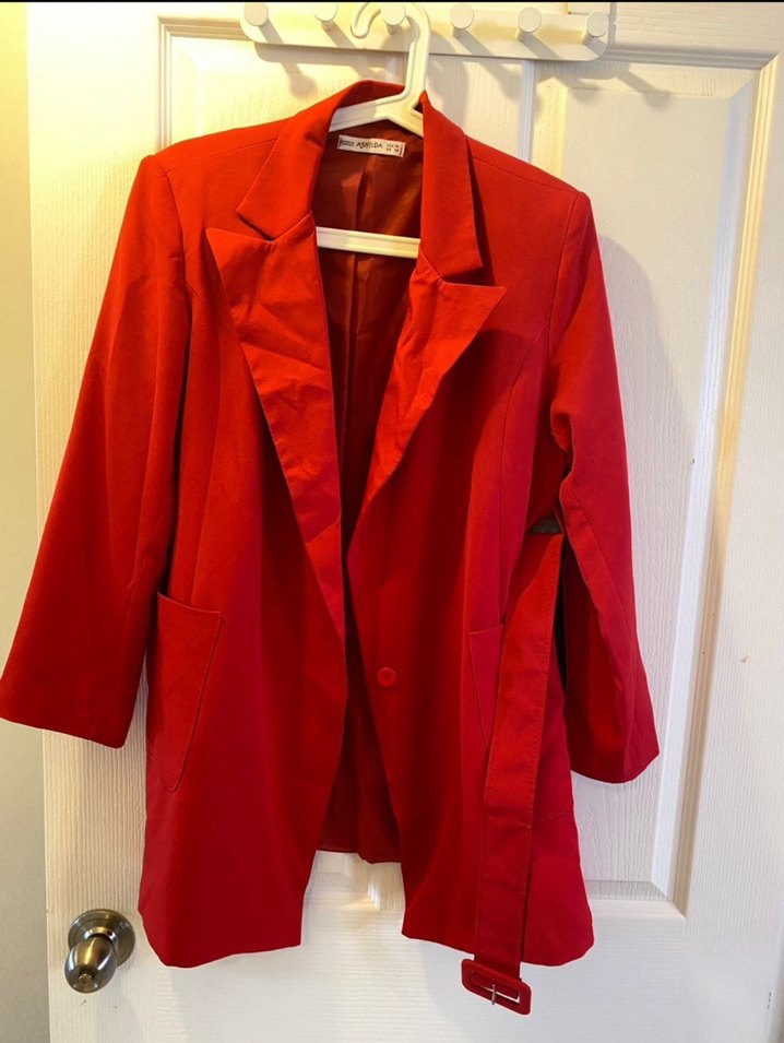 Kadın kırmızı süet uzun ceket, kesik yakalı ve uzun kolludur. Düğmeli detayları ve parlak dokusuyla ofis kullanımı için uygundur. Hiç deforme yoktur s-m-L arası kemerli