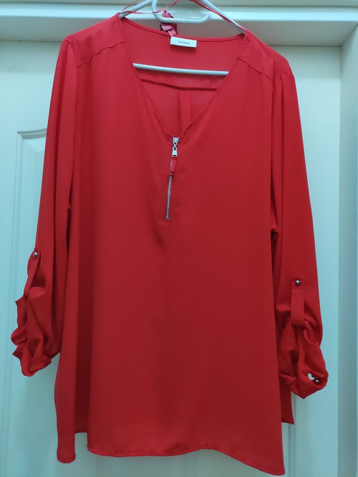 Kadın bluz, uzun kollu, düğmeli manşetli, V yaka fermuarlı ve bol kesimdir. Parlak kırmızı, ipeksi kumaştan yapılmıştır. Günlük kullanım için uygundur.