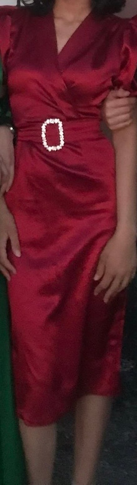 Parlak kırmızı kumaştan, drapeli ve V yakalı, askılı, vücuda oturan kadın abiye elbise. Düğün ve resmi etkinlikler için uygundur. ✨
