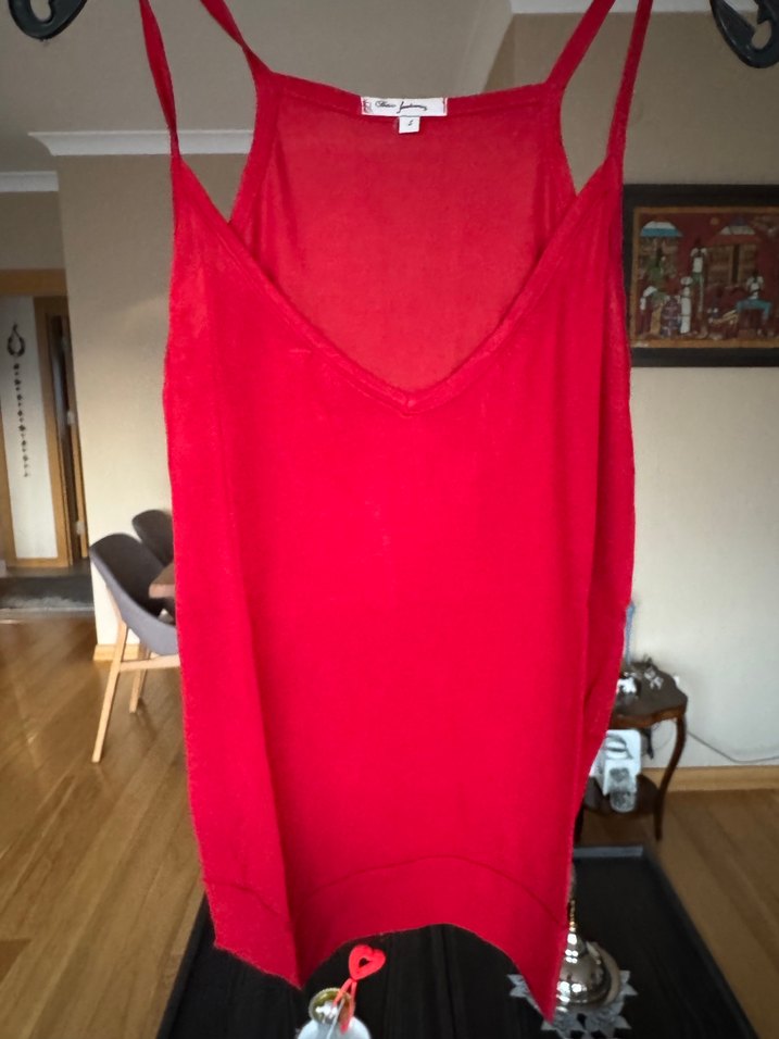 Kadınlar için parlak kırmızı renkte, V yaka ve salaş kesim askılı bluz. İpek gibi yumuşak kumaştan, dökümlü tasarıma sahip, romantik akşamlar için uygundur.