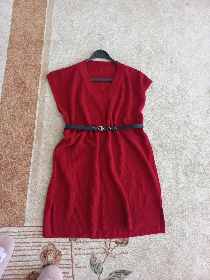 Kadınlar için kırmızı renkli, V yaka, kolsuz, uzun ve bol kesim triko süveter. Sentetik kumaştan örülmüş, sade ve rahat tarzda günlük kullanıma uygun.urun görseli net olsun diye paylaştım elimde olan kırmızı renk mevcut