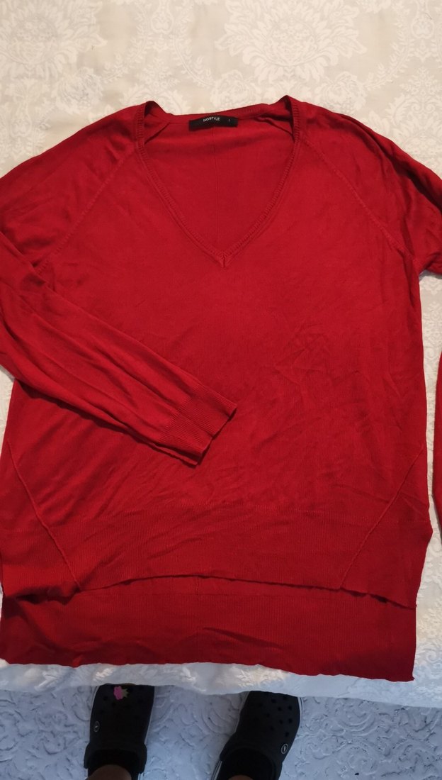Kadınlar için parlak kırmızı renkte, ipeksi dokulu kazak. V yaka, uzun kollu, bol kesim ve midi boyda, günlük kullanıma uygun.