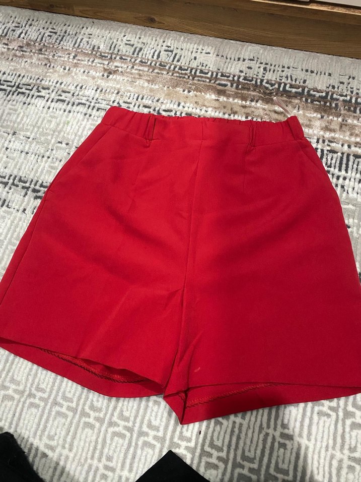 Kadınlar için parlak kırmızı, yüksek bel, mini uzunlukta, düz ve sade şort. Sentetik kumaştan, günlük sokak stiline uygun, rahat ve şık görünümlü.