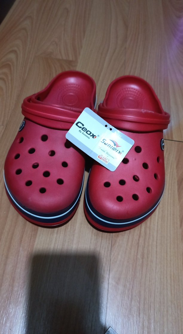 Kauçuk malzemeden yapılmış, kırmızı renkli, yüksek topuklu ve Velcro bantlı kadın terliği. Günlük kullanım için sade ve renkli tasarım. Marka: Ceox.