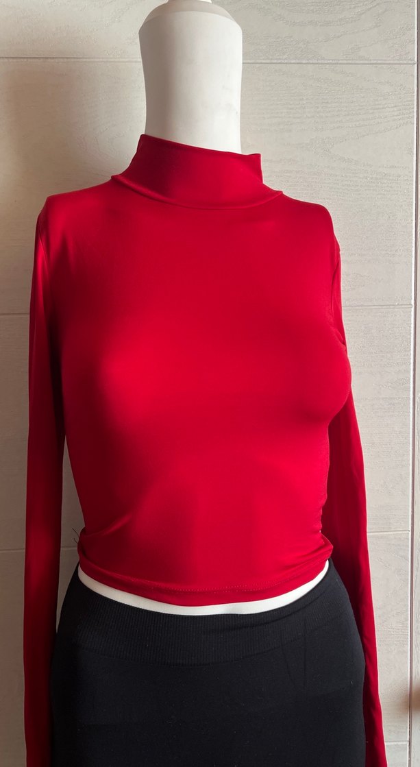 Kadınlar için kırmızı, yüksek yakalı, uzun kollu ve vücuda oturan bir triko. Düz, sentetik kumaştan, midi boyda, rahat şıklık sunan sokak stili.