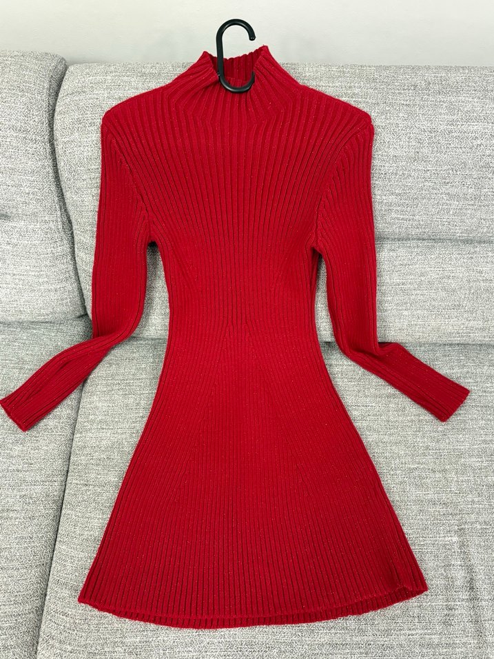 Esnektir. Kadınlar için yüksek yakalı, uzun kollu ve kırmızı renkte, vücuda oturan triko elbise. Yumuşak triko kumaştan, günlük kullanıma uygun.