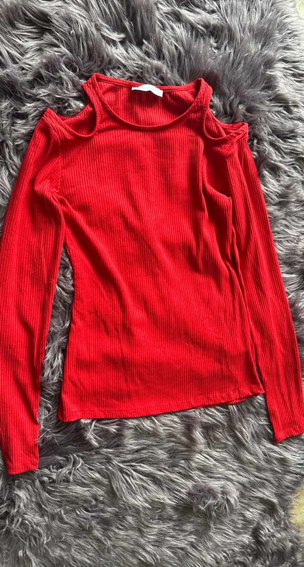 Dar kesim kadın kırmızı triko kazak, yüksek yakalı ve uzun kolludur. Omuzları açık tasarımı ve yumuşak sentetik kumaşıyla rahat sokak stiline uygundur.